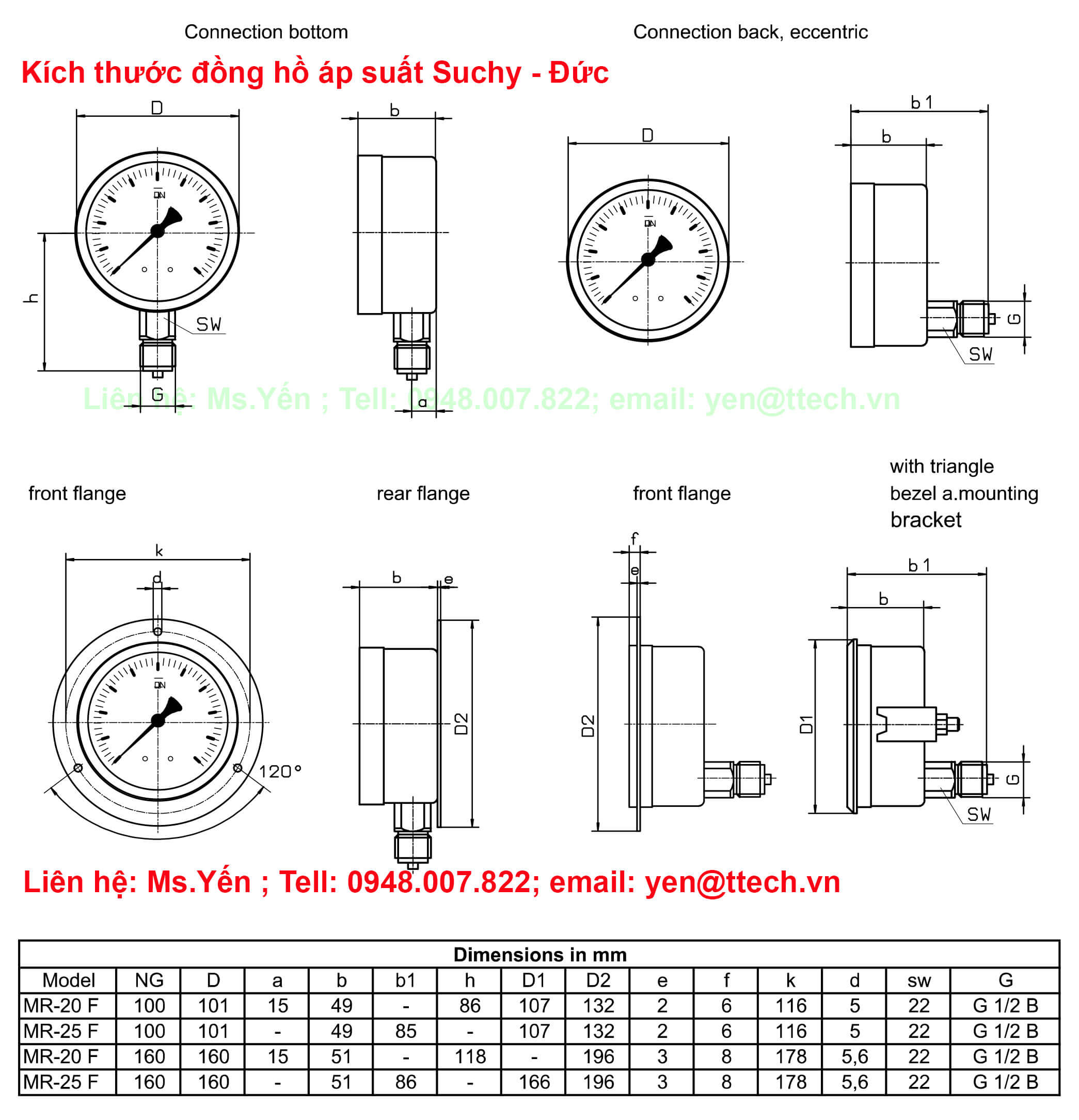 Kích thước đồng hồ đo áp suất có dầu MR-20F; MR-25F